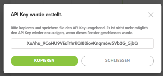 Authentifizierung: Es muss stets der HTTPS-Header „X-API-KEY“ mit einem gültigen Schlüssel aus dem Kundenportal bei der Anfrage vorhanden sein (e.g. „X-API-KEY: apiSchluesselLautKundenportal".